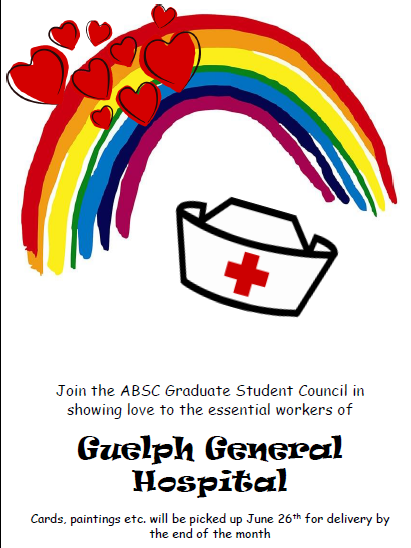 The Animal Biosciences Grad Student Committee will be picking up letters from a basket located in the Department main office (ONLY to be used by staff or students deemed essential and allowed on campus) OR ABSc GSC members will be collecting cards from door steps on Friday June 26th. Cards to be delivered to our Front Line Workers at Guelph General Hospital on Tuesday June 30th.