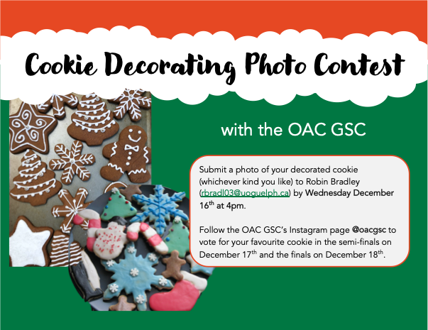 The OAC Graduate Student Council will be hosting a Holiday Cookie Decorating Competition with a prize for best decorated! Entering the competition is easy, just submit a photo of your cookie to Robin Bradley (rbradl03@uoguelph.ca [1]) by Wednesday December 16that 4pm.